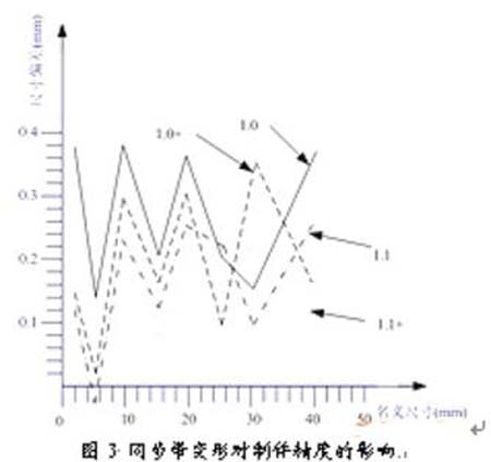 从图3可以看出,在相同光斑补偿直径的情况下,考虑同步带变形补偿系数所得到的制件尺寸精度要高些。在这几种情况下使用1.1mm的光斑补偿直径并设定相应的补偿系数,制件的精度最高。