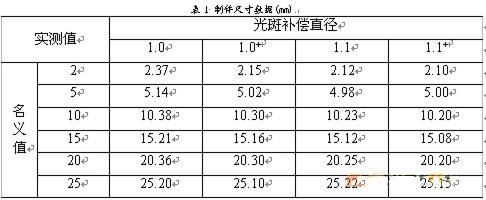 下表即为采用补偿系数和未采用补偿系数时所测得的制件的实际尺寸值,制件的名义尺寸分别为2,5,10,15,20,25mm,所使用的光斑补偿直径分别为1.0mm和1.1mm。