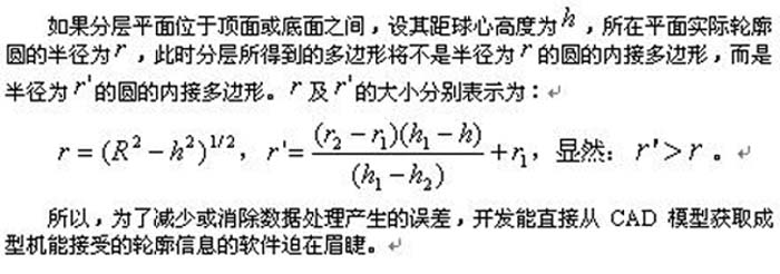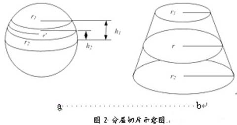 将CAD模型进行STL转换后,接着便要对其进行分层处理。分层是用一簇平行平面沿某一设定方向与STL模型求截交线得到轮廓信息。以半径为 的球体为例,如图2a所示,从中截出特定的一段,设其STL格式为图2b所示,这时其顶面和底面是距球心高度分别为h1 、 h2的两个圆,设其半径分别r1 、r2 。