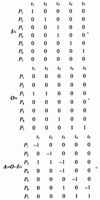 Petri网的结构可以用一个矩阵表示。若从库所P到t的输入函数取值为非负整数w,记为I(P,t)=w,则用从P到t的一有向弧并旁注w表示;若从库所t到P的输出函数取值为非负整数w,记为O(P,t)=w,则用从t到P的的一有向弧并旁注w表示。特别地,若w=1,则不必标注;若I(P,t)=0或O(P,t)=0,则不必画弧。I与O均可表示为nxm非负整数矩阵,O与I之差A=O-I称为关联矩阵。对于规范网,w=1。下面举一实例介绍关联矩阵求最小割集的方法步骤。