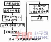 无线模块DTM6211内提供TCP/IP协议栈,可利用PS业务通道发送IP包,以AT指令配置和控制TCP/IP协议栈。利用APP处理器配置TCP/ IP相关环境,注册UDP端口,APP处理器将要发送的数据直接发给模块,由模块将数据封装成符合UDP格式的IP包,然后利用PS业务通道发送给3G网络。其控制流程如图6所示。