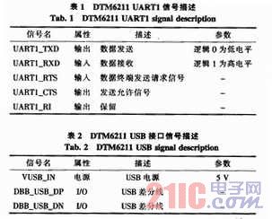 DTM6211接口有2个UART接口,使用UART1作为Hi3510的AT指令接收端口,传输速度设定为115 200 b/s。其UART1信号定义如表1所示。模块的USB接口作为通信口,用于视频数据的传输,其接口信号定义如表2所示。