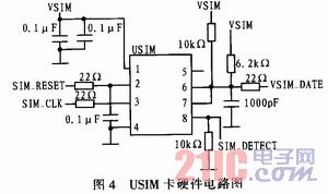 Hi3510和DTM6211之间通过测试板连接,测试板主要作用是连接Hi3510和DTM6211的USB及UART端口,起到一个物理接口转换作用,同时也起到存放USIM卡的作用。USB和UART之间的连接,只需把Hi3510板的USB口和RS232接口连接到测试板对应接口,DTM6211插针接口直接插到测试板上。其中测试板中主要部分USIM卡的硬件电路如图4所示。