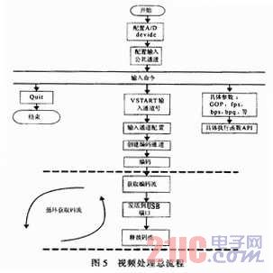视频处理软件主要是对采集过来的视频数据进行H.264压缩,编码中涉及的参数需调用SDK提供的API进行配置,其中包括图像组长度(GOP)、编码帧率(帧/秒)、量化参数(maxqp)、比特率(b/s)和用户数据的插入等,然后将压缩过的裸流,发送到USB端口。其中为了提高压缩率将GOP设置15;为了减少网络数据流量将编码速率设置8帧/秒;量化参数的数值选择在30~40之间,其设计总流程如图5所示。
