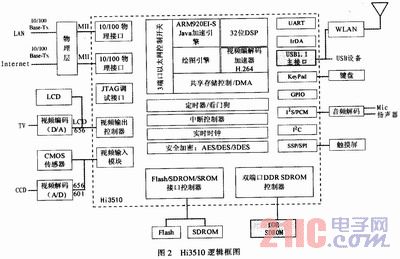 视频处理模块采用Hi3510,该器件是一款基于H.264BP算法的视频压缩芯片,它采用ARM+DSP+硬件加速引擎的多核高集成度的SoC构架,具备强大的视频处理功能,可实现DVD画质的实时编码,能自适应各种网络环境,确保画面的清晰度和实时性,低码率的H.264编码技术极大减少了网络存储空间,并通过集成DES/3DES加解密硬件引擎确保网络安全。图2为Hi3510逻辑框图。