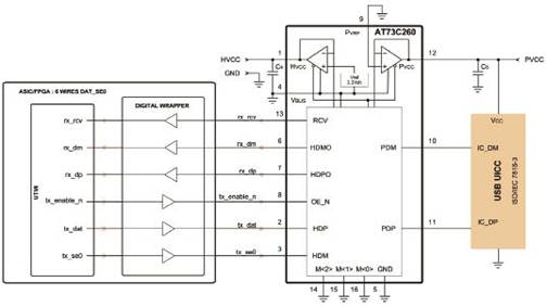 AT73C260是片内USB收发器,完全符合通用串行总线规范的要求,具体地说是与IC_USB1.0兼容。AT73C260是一种双向差分接口。AT73C260特别适于用于移动器件、PC和使用USB UICC 的Token USB。