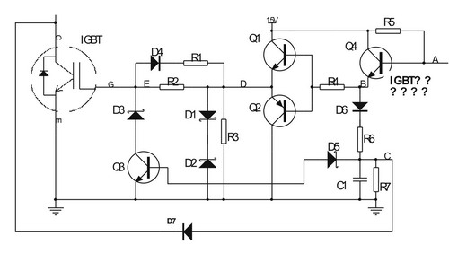 其中A点为IGBT的控制输入信号。当输入高电平的时候,Q4导通,则B点为高电平,从而驱动Q1导通,Q2截止,使得D点电压为+15V,然后通过电阻 R2驱动IGBT,此时D4相当于开路,R2为断开的。D1、D2为15V的稳压二极管,他们可以控制IGBT的G点在15V, 控制IGBT导通。当A 点输入的是低电平,Q4截止,B点为低电平,从而驱动Q2导通,Q1截止,D点电平为低的,这时R1与R2认为是并联的,使得IGBT为截止状态。