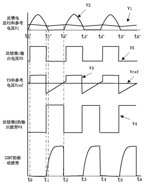 t1-t2过程:IGBT为导通状态,这个时间段内,电感L2的电流急剧增加,如图3所示,反馈电压V2接近0,比较器1的输出口V5也为低电平。在这个时候,电容C5开始充电,当这个电压(V3)高于功率参考电压Vref的时候,比较器2的输出口电压发生翻转,把IGBT的驱动电压强行拉低了,这就是一个IGBT导通的一个过程。