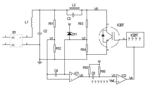 在脉宽调制电路中,通过改变 电平的值,可以控制功率,它是由单片机输出与电流负反馈信号共同决定的。IC1和IC2为快速比较器LM319。如图2中所示,当V3》 时,比较器的输出端相当于开路,通过外接上拉电阻,可以得到高电平,从而驱动IGBT导通,而当V3《 时,比较器的输出口相当于接地,输出为低电平。