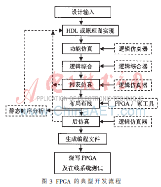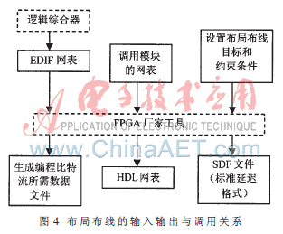 FPGA的典型开发流程如图3所示。在图3中,逻辑仿真器主要有Modelsim、Verilog-XL等,逻辑综合器主要有LeonardoSpectrum、Synplify Pro、FPGA Express/FPGA CompilerII等,FPGA厂家工具有Altera公司的Max+PlusII、QuartusII,Xilinx公司的Foundation ISE、Alliance等。设计输入主要有原理图输入和HDL输入两种方式,绝大部分设计,FPGA和ASIC的工程师都使用HDL平台。设计仿真主要包括功能仿真和网表仿真,设计仿真需要RTL代码或综合后的HDL网表和验证程序,有时候还需要测试数据,测试数据可能是代码编译后的二进制文件或使用专门的工具采集的数据。布局布线工具利用综合生成的网表、调用模块的网表,根据布局布线目标,把设计翻译成原始的目标工艺,最后得到生成编程比特流所需的数据文件。布局布线一般需要的输入输出与调用关系如图4所示。布局布线目标包括所使用的FPGA具体型号等,约束条件包括管脚位置、管脚电平逻辑(LVTTL、LCMOS等)需要达到的时钟频率,有时包括部分模块的布局、块RAM的位置等。在一般设计中,只需要注意管脚位置和需要达到的时钟频率,逻辑端口与FPGA管脚的对应取决于PCB板的设计。