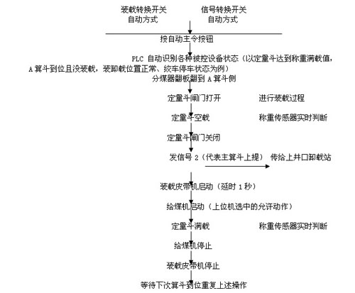 自动装载的顺序是:箕斗到位后,箕斗到位传感器自动发出停车信号,定量斗闸门打开,装载控制台显示屏上的闸门开灯亮。定量斗开始向箕斗装煤,等到显示屏上“定量斗满载”LED显示熄灭, “定量斗空载”LED显示点亮,,PLC自动关闭闸门。等到显示屏上的闸门灯亮,信号自动发出,(使皮带向定量斗装煤)同时启动皮带机,再经过一段时间延时,等到皮带机正常运转后,启动给煤机开始向定量斗装煤,此时称重显示瞬时值,等到显示屏上出现“满载”LED 显示,自动停止给煤机,皮带机运转,为下一勾提升作准备。当装载过程中出现特殊情况时,可按下装载部分的急停按钮,整个装载部分设备将全部停止工作,等到故障处理完后再进行工作。