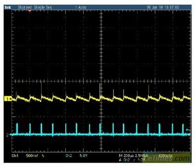 在电路原理图(图2)中,Q1是主要开关晶体管。MOSFET Vds击穿和D1的击穿电压应大于电路的最大预期输出电压。当微控制器检测到输出电流低于预期大小时,它会快速地连续四次对MOSFET加脉冲以提高电压 输出。这四个脉冲将产生更大电流和加速负荷下的上升时间。或者,可用PWM驱动MOSFET,这样允许来自升压电路的更高输出。R6/C6为电流检测网 络。