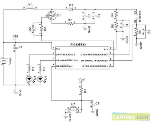 通常,电离子透入疗法所用的电流大小会随着药物的不同而变化,并且需要依据特定药方进行确认。电流由PIC12F683的一个外部电阻R3和一个内部比较器进行控制。通过定义期望电流,范围在0.5〜4毫安,比较器的阈值被设定在了代码中。