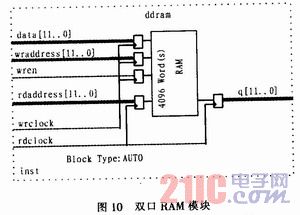 首先要确定波形RAM的深度和字长,由于任意波形发生器设计中选择的DAC的字长是12位,很明显波形RAM的字长也应该是12位;由于选择的地址线位数为12位(即相位累加器输出的高12位),寻址空间为4 K(4 096)个单元,即RAM存储空间应为4 096x12 bit=49 152 bits,由于本设计所选择的FPGA内部RAM最大可配置为119 808 bits,完全可以满足49 152 bits的RAM空间设计。所以波形RAM设计为字长12位,地址线12位。针对任意波形发生器与普通DDS的不同,波形RAM的设计主要要求RAM具有读写两个端口,这样可以通过两套地址系统,方便地进行RAM内容更新,即对RAM的写操作;波形幅度量化数据的输出,即对RAM的读操作。结合ALTERA公司FPGA的特点,选择了EP2C5F256C6这个芯片内部的双口RAM来实现这个功能,如图10所示。