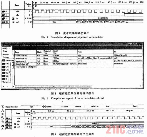 下面介绍超进位流水线累加器的构成,比较流水线累加器内部结构图和超前进位加法器的32位相位累加器的结构图,可以看出两个图的区别,经过编译以后的报告如图8所示,可以看出经过改进后,编译的最大工作频率提高到了336.7 MHz。比单纯的流水线累加器提高了将近20 MHz。