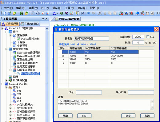 建立一个名称为“时间间隔初始值”的初始寄存器值表,将ON时间设定为750和OFF时间设定为5500(当然也可以不建立该表而选择在程序中初始化V2000-V2001及 V2002-V2003的值),如下图: