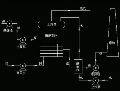 锅炉的电气控制系统包括锅炉本体、鼓风系统、引风系统、进煤系统、输煤系统、除尘器系统、省煤器系统。结构框图如下: