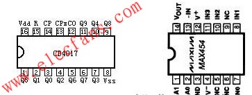 IC2(CD4017,十进制记数、分配器)组成视频切换电路。当有时钟脉冲" title="时钟脉冲">时钟脉冲从14脚输入时,Q0~Q4会依次输出高电平" title="高电平">高电平(见图3