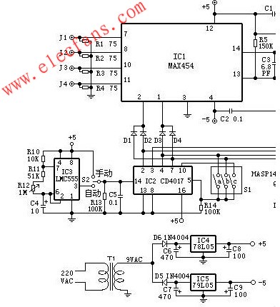 电源部分由T1、IC4、IC5和D5、D6及C6~C9构成±5伏电源。