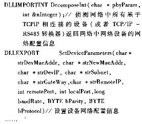 设备支持ARP,ICPM(ping),IP,UDP网络通讯协议,数据传输方式默认采用UDP协议,不支持数据包分组操作.数据编码方式采用HEX的数据格式操作,所有通讯数据采用“以太网CRC校验”方式,其中UDP层加UDP校验,应用数据层再加“和校验”方式,具体校验方式采用从报头至报尾所有的协议数据按16进制做累加,对256取模后的十六进制数.应用数据层的通讯协议格式如表1~3所示,其中数据单位为bit。