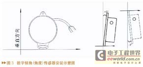 数字倾角(角度)传感器通过RS232与单片机接口。红线为电源输入,黑线为地(RS232地与电源地共用),黄线为传感器的RS232输入,绿线为传感器的RS232输出。输入电源电压为7V-24V,推荐值9V。传感器应竖直安装,安装面与垂直面的夹角不大于2°。安装示意图见图3。