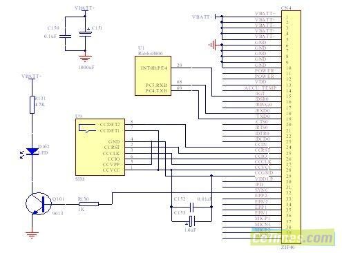 西门子公司的MC35模块具有一个40脚的零插入力连接器,该连接器中提供了串行接口、音频接口、SIM接口、状态引脚、电源接口等接口,通过这些接口与 SIM卡座、天线以及主控制器相连。MC35的串行接口TXD0和RXD0与Rabbit3000的串口B,即引脚TXB和RXB(PC4和PC5)相连,以实现与MC35之间的通信。MC35的IGT引脚为其启动引脚,需要开漏极驱动器驱动。而Rabbit3000的端口E具有很强的驱动能力,因此选用PE5作为MC35的启动控制线。在MC35的电源接口中有电源输入引脚、电源输出引脚和充电引脚,其中充电引脚可用来给电池充电。本系统采用电池供电或外部充电。如图2所示。