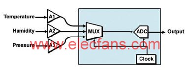 单个高分辨率ADC的优点是简单(见图3)。如果使用16位ADC,对于较小动态范围的信号,丢失3、4或5位会使该信号的有效分辨率降至11至14位。然而,对于大多数传感器来说此精度足够了,因为ADC的精度相当于0.05%或更佳。