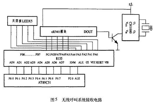 图5为接收电路示意图,它由接收芯片nRF401、并行接口芯片8155、单片机AT89C51及共阴极LED和语音报警提示电路等组成。 CH1000是一种专为蜂鸣器设计的双极型集成电路,当RF401接收到信号之后,其输出驱动外接压电片HD发出报警声。单片机通过并行接口8155驱动 LED显示。