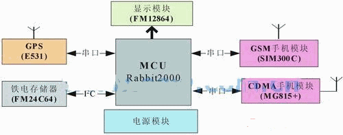 图1为车载终端的结构图,车载数据终端主要包括单片机(rabbit2000)、GPS模块、CDMA 手机模块、GSM手机模块、铁电存储器、电源变换模块等。其中,CDMA模块负责所采集数据的无线传输。
