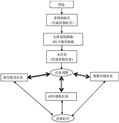 在移植了礐/OS-II并嵌入了USB和SD/MMC卡的驱动程序后,监控器的应用层次的软件安装系统的功能分为优先级不同的多个任务。其中主任务用于生成其他任务,其优先级最高(10);GPS接收任务负责控制MG-30U/R-GPS模块,并从中获取所需要的GPS数据,其优先级次高(12);短信收发接收任务完成接收车主短信和发送GPS数据的功能,其优先级再次之(14);最后,数据存储功能完成GPS在SD卡中的存储和系统设置的功能其优先级为16。程序中同时建立了消息队列用于完成各任务间的通信和数据交换,软件状态流图如图4所示。