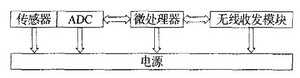 目前,还没有形成通用的无线传感器网络节点的设计方案,但一般都包括四个组成部分:传感器、微处理器、无线收发模块和电源。如图2,传感器负责监控物理信号,比如i是度、空气湿度、震动信息等。微处理器通常采用嵌入式cPu或者微控制器Mcu,无线收发单元主要由低功耗、短距离的无线通信模块组成。
