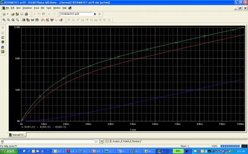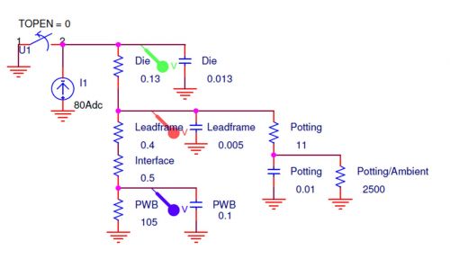 图 2 显示了图 1 的仿真结果以及由此产生的电压响应。其功耗为 80 瓦,不同的时间恒量一眼便能看出。绿色曲线为裸片温度,其迅速到达一个 PWB 相关恒定电压(蓝色曲线)。您还可以看到一个引线框的第二时间恒量(红色曲线),其稍微有一些滞后。最后,您还可以看见 PWB 的近似线性充电,因为大多数热能(电流)都流入其散热电容" title="散热电容">散热电容。