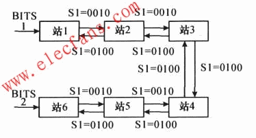 当两个站点传输中断时,如图4所示,例如发生在站4和站5之间,这时,站5、站6主用的外部时钟源不变,但失去了备用的外部时钟源。站4 由原来跟踪B ITS2转换成跟踪B ITS1 的时钟, 同时向站3 发送S1111,因此,站1、站2和站3失去了备用的外部时钟源。直到电路传输恢复时钟源跟踪关系才能恢复。广州市广播电视数字微波电路的时钟配置就是采用这种方式。