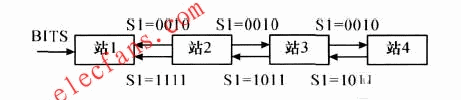 当两个站点间传输中断时,譬如发生在站2和站3之间,正常时钟跟踪链从传输中断处的下游网元(站3)的跟踪状态会发生变化,进入保持模式,同时向下游网元(站4)插入S1字节1111,下游网元站因此也进入保持模式,如图2,这时站3以下的站点全部进入保持模式,电路部分进入时钟跟踪异态,直到站2 和站3之间传输恢复才恢复全电路的时钟跟踪稳态。