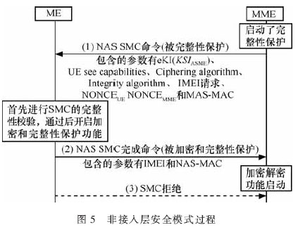由图5可知,非接入层的安全模式过程是由网络发起的,MME发送的SMC消息是被非接入层完整性保护了的,但是没有被加密。参考文献[4]指出UE在收到SMC消息后,首先要比对消息中的UE security capabilities(安全性能力)是否和自己发送给网络以触发SMC过程的UE security capabilities相同,以确定UE security capabilities未被更改,如果相同,表示可以接受,没有受到攻击,nonceMME和nonceUE用于切换时的安全性激活,本文就不再赘述;其次,进行NAS层密钥的生成,包括KNASenc和KNASint, 前者为NAS加密密钥,后者为NAS完整性保护密钥;接着,UE将根据新产生的完整性保护密钥和算法对收到的SMC消息进行完整性校验,校验通过,表示该SMC可以被接受,此安全通道可用;最后,UE发出安全模式完成消息给MME,所有的NAS信令消息都将进行加密和完整性保护。如果安全模式命令的校验没通过的话,将发送安全模式拒绝命令给MME,UE退出连接。如图5中的第3步。