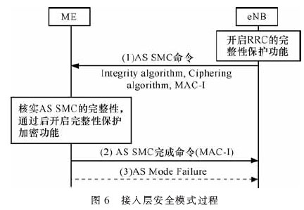 在非接入层的安全性激活后,紧接着将要进行接入层的安全性激活,采用AS SMC命令来实现的。如图6所示,网络端通过已经存在的KASME来生成KeNB ,利用KeNB生成完整性保护密钥对AS SMC这条消息进行完整性保护,并生成一个信息确认码MAC-I;之后,将AS SMC传给ME。参考文献[5]指出ME首先利用密钥KASME来生成KeNB , 之后利用收到的算法和KeNB通过KDF生成完整性保护密钥,然后对此AS SMC信息进行完整性校验,具体是通过生成一个X-MAC,如果X-MAC和MAC-I相匹配的话,通过校验,之后进一步生成加密密钥,并发送AS SMC完成消息给eNB,此条消息也要进行加密和完整性保护,也要生成一个信息确认码MAC-I,具体用途已介绍,此步骤非常重要,假如校验不通过,UE会向eNB返回一条AS Mode Failure消息,表明此通道不安全,UE是要退出连接的。eNB对AS SMC完成消息进行完整性校验通过后,此时接入层的安全性就激活了,可以开始传输数据了。