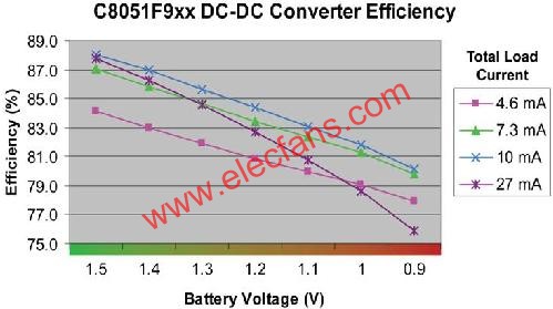 Silicon Labs新近推出的C8051F9xx微控制器系列所采用了集成式解决方案。该方案将高度优化的增压DC-DC转换器集成至微控制器中,其能将0.9~1.5V之间的电池电压增至1.8~3.3V之间的可编程输出电压。升压后的电压会被用于微控制器的I/O管脚及外围。如图1所示,通过使用一个优化的65mW DC-DC转换器,此转换器依然可保持80%至90%的高效率。
