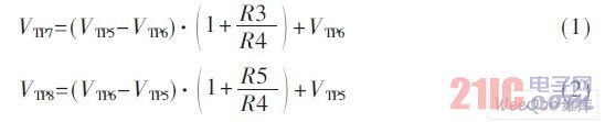式(1)~式(7) 中所有加减运算均为矢量相加减, 式(7)表明该差分放大电路的差分放大倍数A 由电阻R3、R4、R5 确定。
