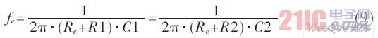 交流耦合差分放大电路如图2 所示。电容C9、C10、C11 的值远小于电容C7、C8 的值, 因此, 电容C9、C10、C11 对图2 中高通滤波器的影响可以忽略, 从而可得共模高通滤波器的截止频率fHPc。