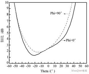 从图5 中可以看出,微带天线的部分轴比小于3 dB,从而实现了天线的圆极化,但是微带天线的最大辐射方向偏离轴向,天线的轴向比变差。该微带天线基本可以满足圆极化的要求。
