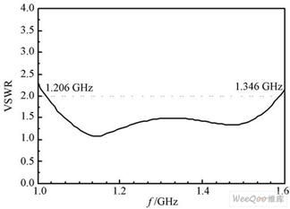 在VSWR<=2 时,频带范围在1. 206~ 1. 346 GHz之间,带宽达到了140 MHz,相对带宽达到了11. 04%。在工作频段内,天线的增益有稍许提高,轴比可以接受,所以此天线结构是一种比较经济实用的微带天线结构。