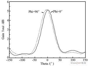 由图4 可以看到,双层微带天线的增益达到了5. 2 dB,较之传统的微带天线增益有少许增加,由此可见,双贴片的微带天线在提高增益方面也有一定的贡献。若要大幅度提高微带天线的增益,则可以在顶层贴片上再覆盖一层ε r》 1 的介质基板即可。