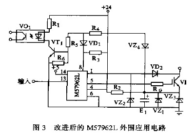 针对以上两种情况,笔者在厂商推荐应用电路的基础上改进了IGBT驱动模块M57962L的外围电路,如图3所示。在正常情况下.VZ4导通,M57962L⑧脚为高电位,VD1截止。VT2导通。VO1输出端呈低阻态。如果稳压二极管VZ1或VZ3击穿短路,则VZ4截止,VT1截止,VO1输出端呈高阻态。如果驱动电路失去+24V 电压,则VO1输入端无电流通过,VO1输出端呈高阻态。