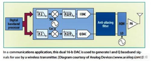 图:在通信应用中,这款双通道16位DAC用于产生同相(I)和正交(Q)基带信号供无线发射器使用。