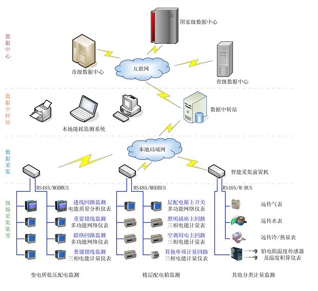 Acrel-5000建筑能耗分析管理系统是上海安科瑞电气股份有限公司针对建筑能耗开发的软件平台,以计算机、通讯设备、测控单元为基本工具,根据现场实际情况采用现场总线、光纤环网或无线通讯中的一种或多种结合的最优化的组网方式,为大型公共建筑的实时数据采集及远程管理与控制提供了基础平台,它可以和检测设备构成任意复杂的监控系统。开放性、网络化、单元化、组态化的采用面向对象的分层、分级、分布式智能一体化结构。系统基于对114号文件的充分理解,建立如下层次结构:
