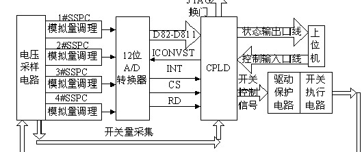 如图1所示,每路SSPC取样电阻上的电压经过调理电路和低通滤波器以后,送到4通道A/D转换器的一个模拟输入端,A/D转换器的数据输出端、状态信号和控制信号分别接到CPLD的I/O引脚,便于程序控制A/D转换器的动作。CPLD另外的I/O口可以配置为MOSFET的开关命令输出口线、SSPC的状态输出口线和与上位机相连的控制命令输入口线;CPLD自身提供的JTAG BST电路,可以方便的测试系统内部器件之间的连接和检验器件的操作。