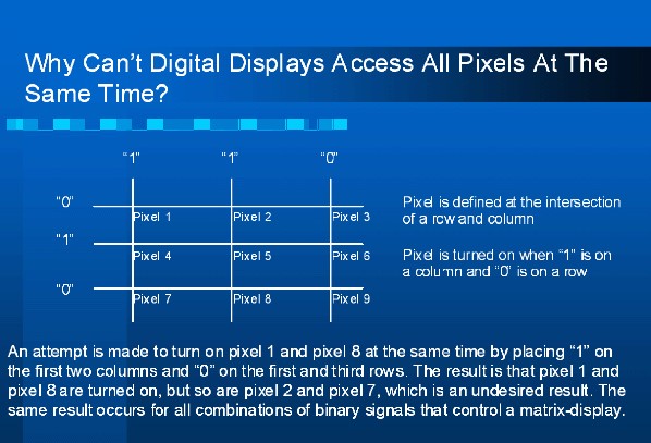 由于存在上述数位控制的问题,画素级的多线定址方法一直是类比式的。影像数据在处理器中仍以数位方式处理,但採用影像分解方法将影像分解成行列数据,然后再以数位类比转换器(DAC)转换成类比讯号。类比的行与列讯号通常是OFDM载波,而行与列讯号中的每个频率元件代表显示器中单一画素的控制。