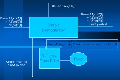 每个行列讯号的交叉点映射每个画素的频率控制(每列讯号具有相同的频率,但每行讯号的频率不同)。每个画素包含一个简单的解调电路,能够解调输入的行列讯号,而产生一个可控制画素亮度的讯号振幅(图2)。如此一来,所有的画素就能够同时加以控制,并且表现出不同的亮度。