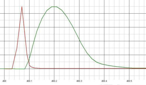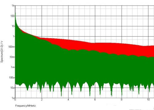 红色的是R3=1欧姆,绿色的是R3=100欧姆。可见,驱动电阻大的时候,高频谐波明显变小。