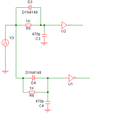 在有源钳位,不对称半桥,以及同步整流等场合,需要一对互补的驱动,那么怎么用一路驱动来产生互补驱动,并且形成死区。可用下图。